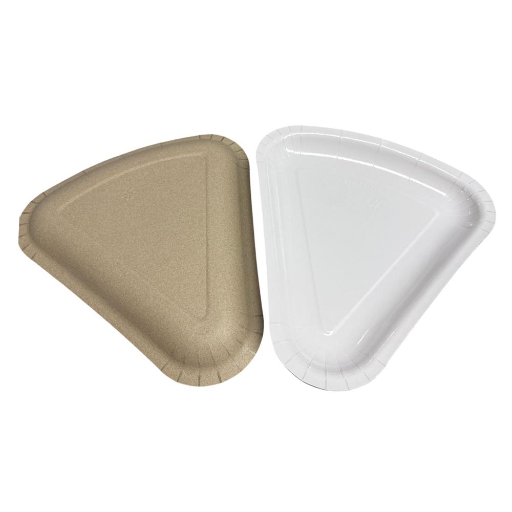 This is a disposable paper-plastic laminated triangular tray, designed specifically for triangular pizza slices, small cakes, breads and other foods.