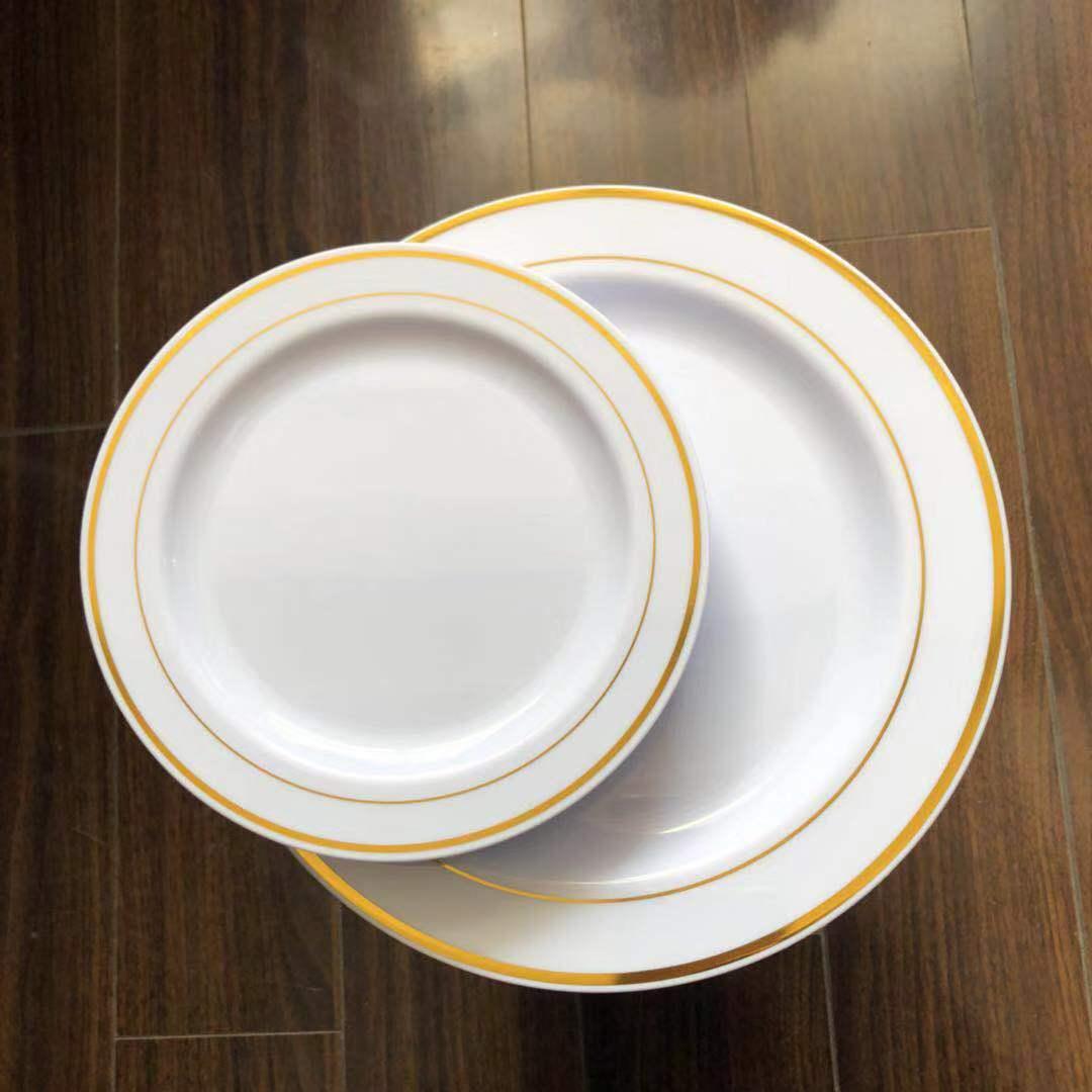 Elevate your party décor with our fancy dinnerware set. Made of durable and reusable plastic,
