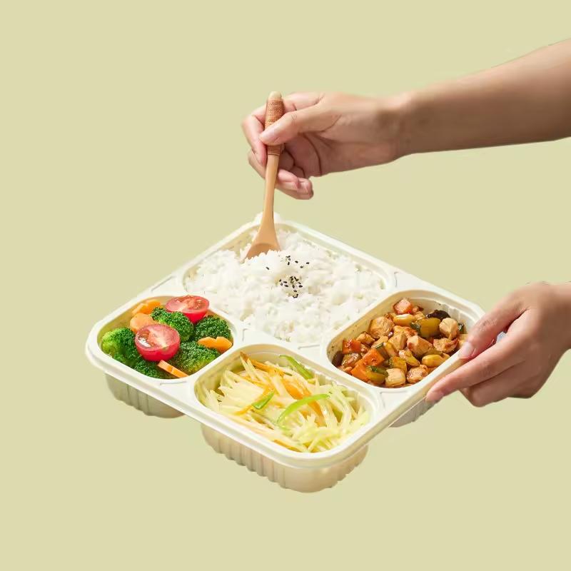 OWENTEK Corn Starch Bento Lunch Box 23.9x17.8x4.4cm Disposable Restaurant Container Eco-Friendly Biodegradable Cornstarch Bento Boxes - 4-Compartment Takeaway Food Containers for Party Restaurant