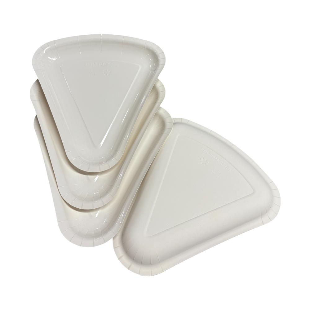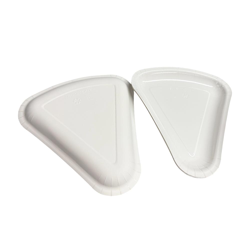 This is a disposable paper-plastic laminated triangular tray, designed specifically for triangular pizza slices, small cakes, breads and other foods.