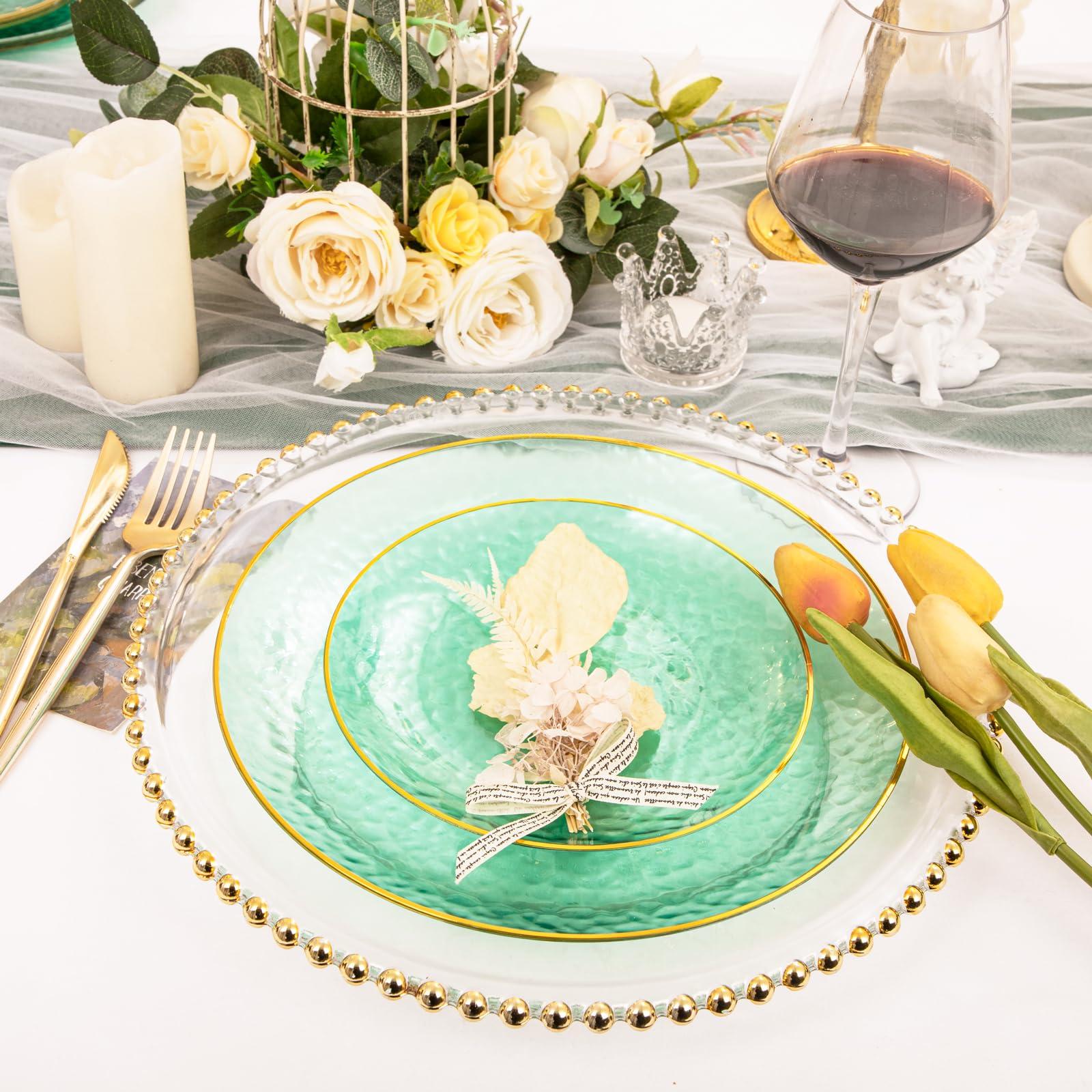 With a hammered finish and gold rim, these green and gold plates add a touch of sophistication to your parties or special events.