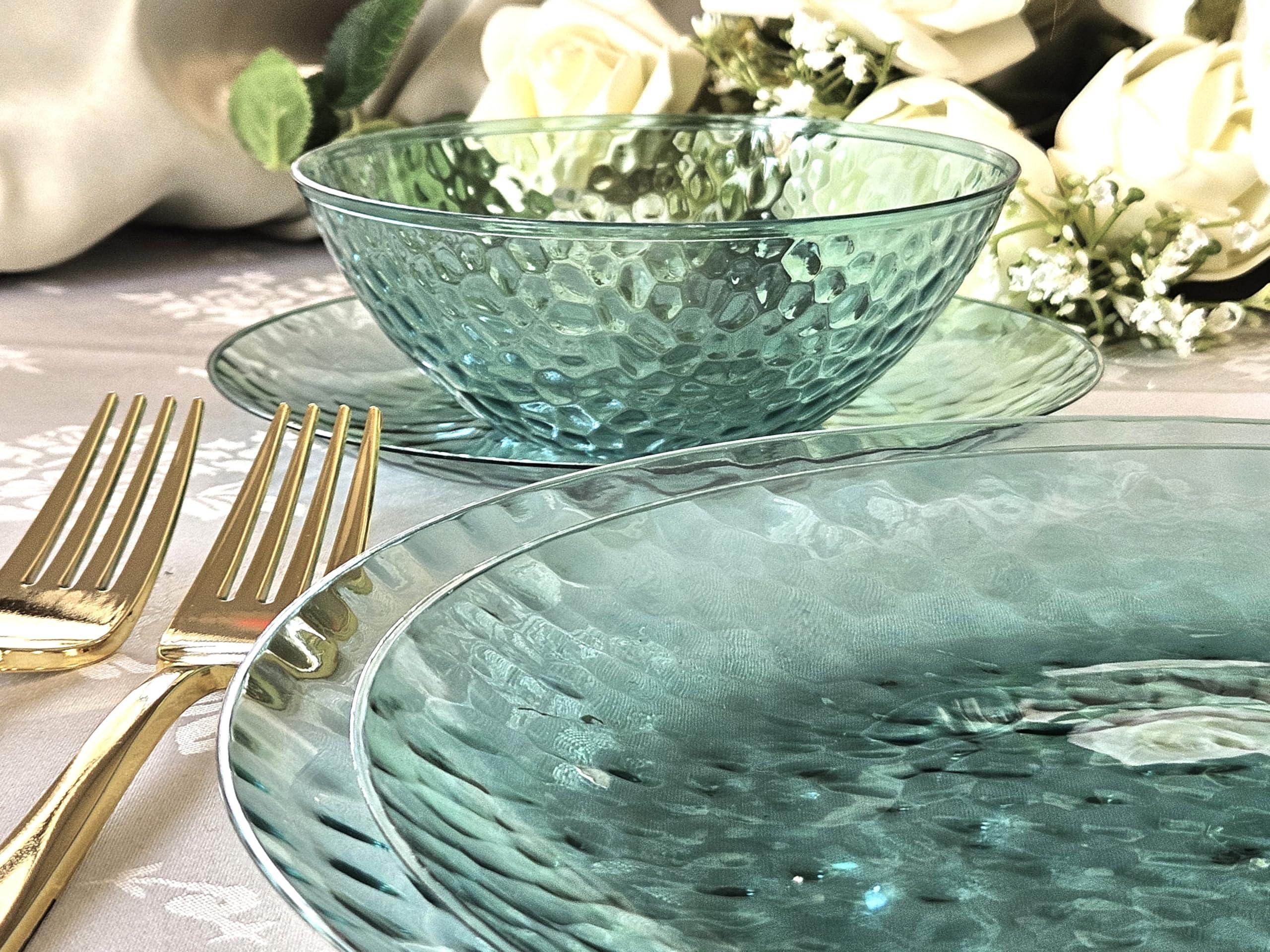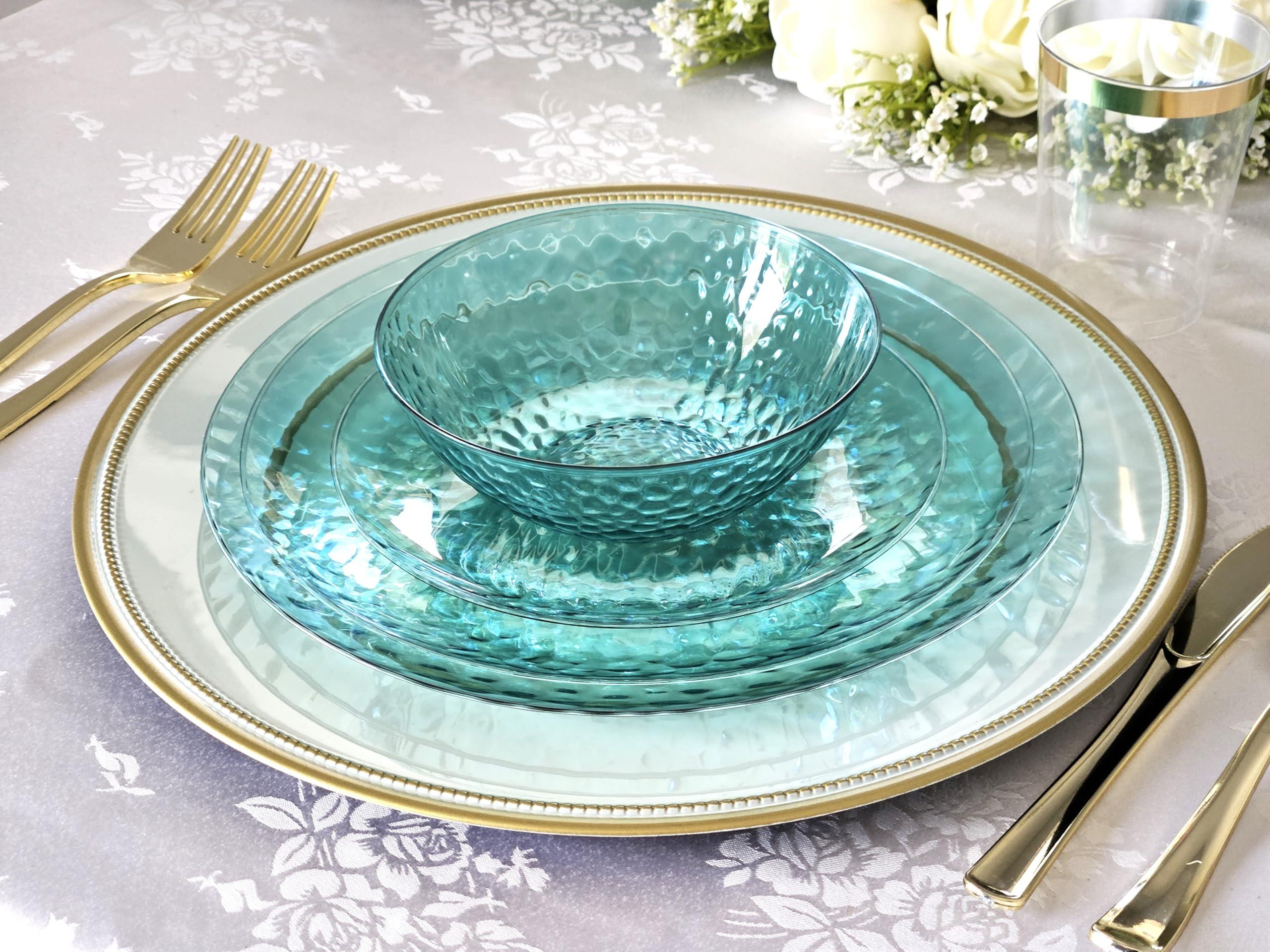 These Green plastic plates are elegant and modern, making them a cheaper alternative to real porcelain. Multiple colors can match your decor and complete your dining table.