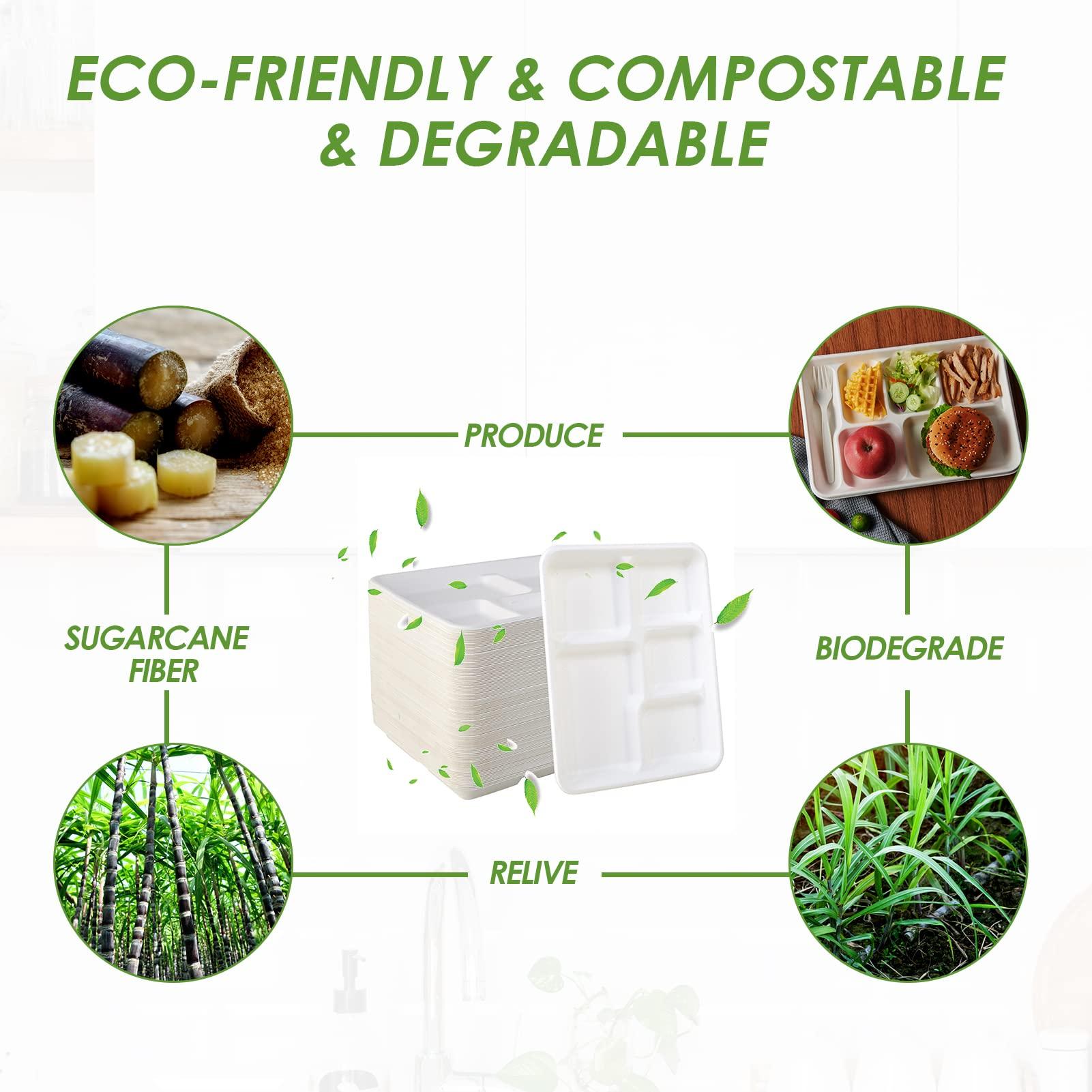 By reusing the natural fibers of sugarcane, this material is 100% sustainable and renewable for the environment, these divided plates are dye-free, BPA-free,